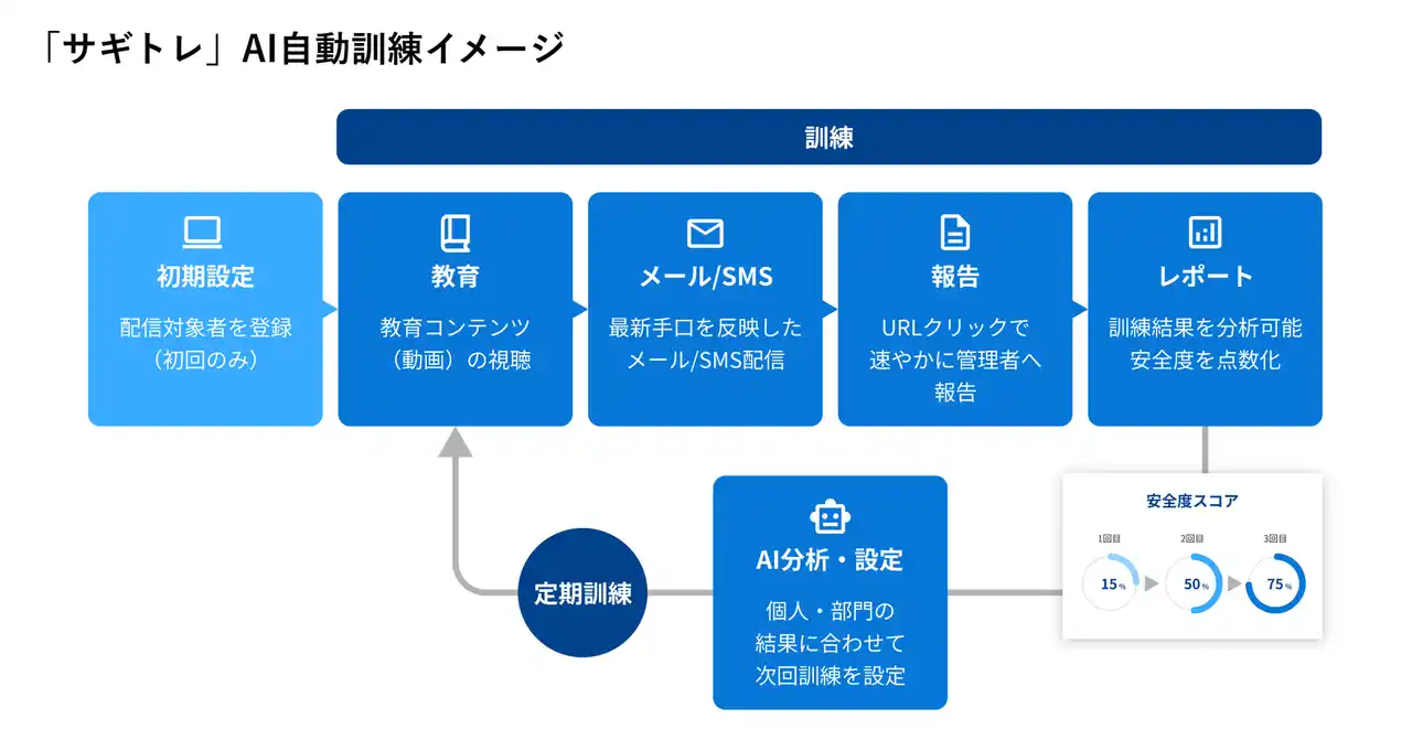 | ユーザー企業の従業員は、「サギトレ」のシステム上で詐欺の手口や注意すべきポイントを学ぶ教育コンテンツを視聴し、その後、実際の業務環境の中で疑似的な詐欺メール・SMSを受信します。AIがその対応結果を分析し、個人や部門ごとのリスク傾向を可視化。分析結果に基づき、最適な訓練内容や配信スケジュールを自動で設定します。 | |||||||