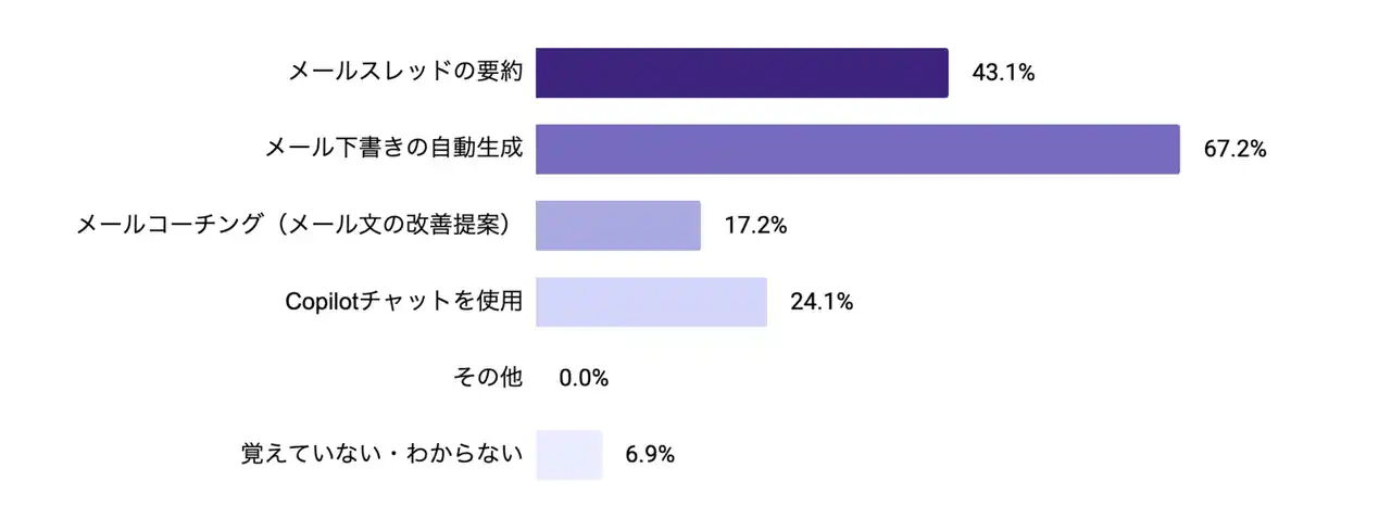 | Outlookでは「メール下書きの自動生成」が最も活用されており、次いで「メールスレッドの要約」が2位となりました。 | |||