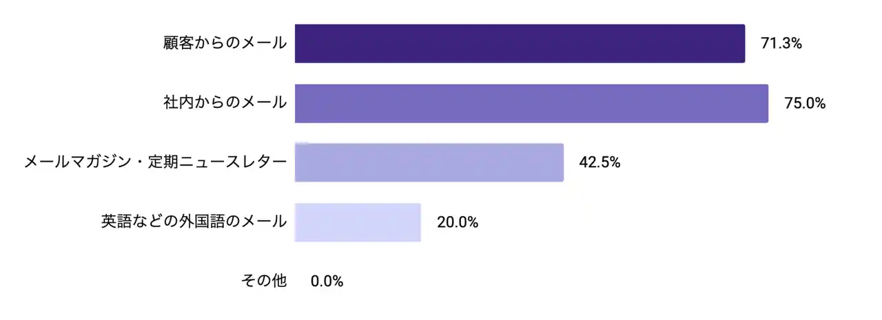 「社内からのメール」「顧客からのメール」がそれぞれ7割を超え、主に社内外の関係者から受け取ったメールで要約機能が使われていることが分かりました。 また、メールマガジンや定期ニュースレター(42.5%)、英語などの外国語メール(20.0%)でも活用されており、日々の情報整理のツールとしても活用されている様子が見られます。 |