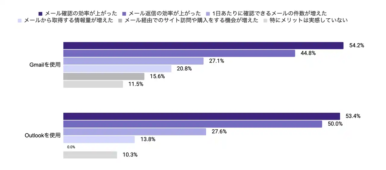 また、メールソフト別に見てみると、GmailとOutlookのいずれも「メール確認の効率が上がった」が最も多い結果となりました。 「メール経由でのサイト訪問や購入をする機会が増えた」と回答した方はGmailでは15.6%いる一方で、Outlookでは0%でした。 |