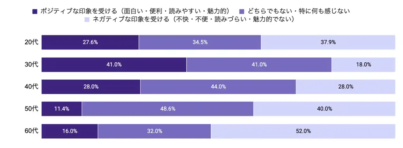 | 一方、60代では「ネガティブな印象を受ける」と回答した人が多く、世代によって感じ方に違いがあることが分かります。 | |||
