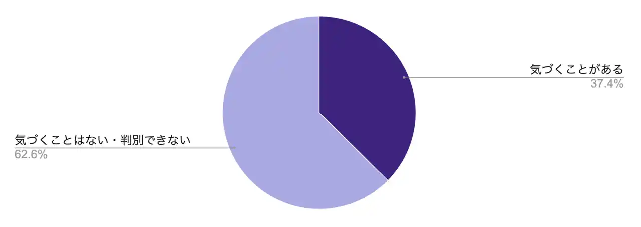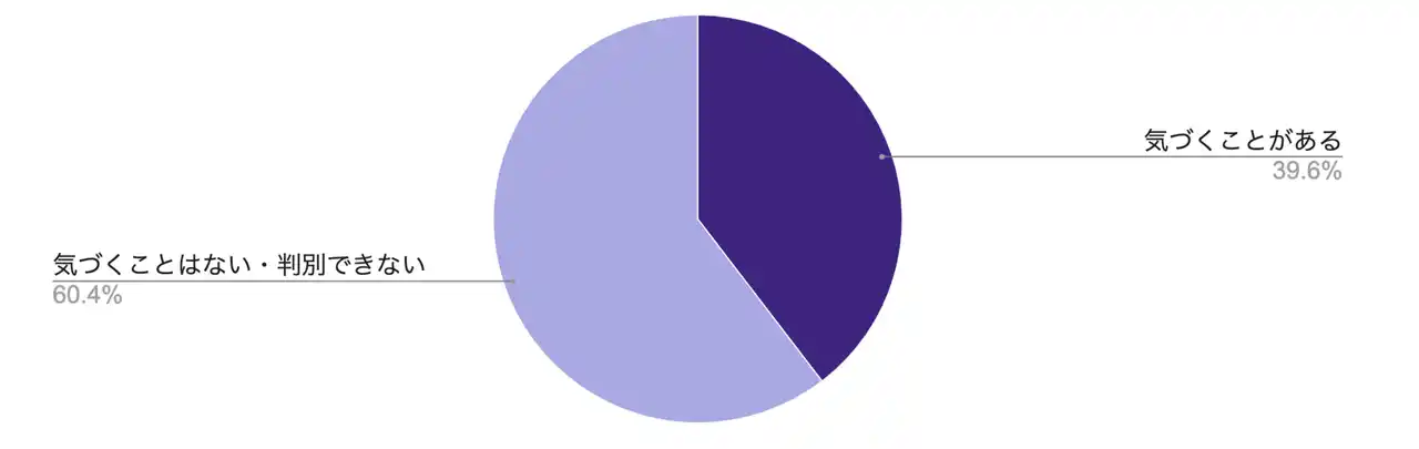 | 一方で、約4割弱は「気づくことがある」と答えており、AI特有のパターンを見抜ける利用者も一定数いるようです。こうした違いは、AIコンテンツへの慣れや経験の差によるものと考えられます。 | |||