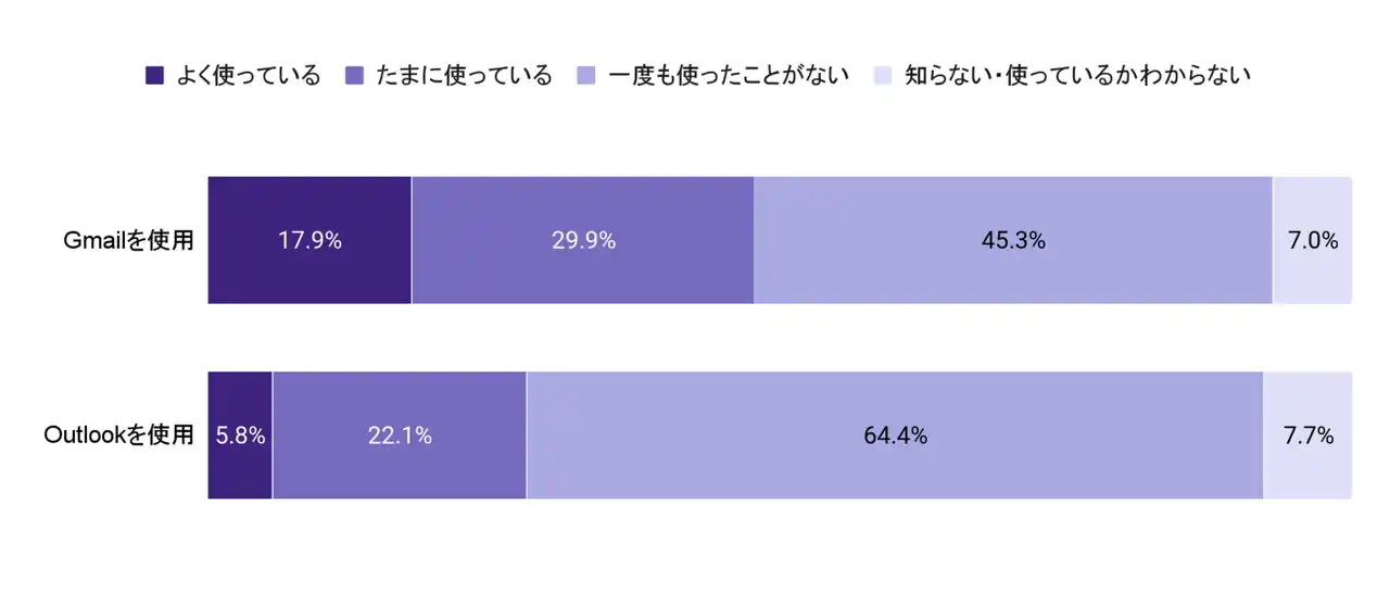 | メールサービス別に見てみると、Gmailユーザーの方が生成AI機能の利用率は高く、「よく使っている」と回答した方はGmailがOutlookより12.1ポイント高い結果となりました。 | |||