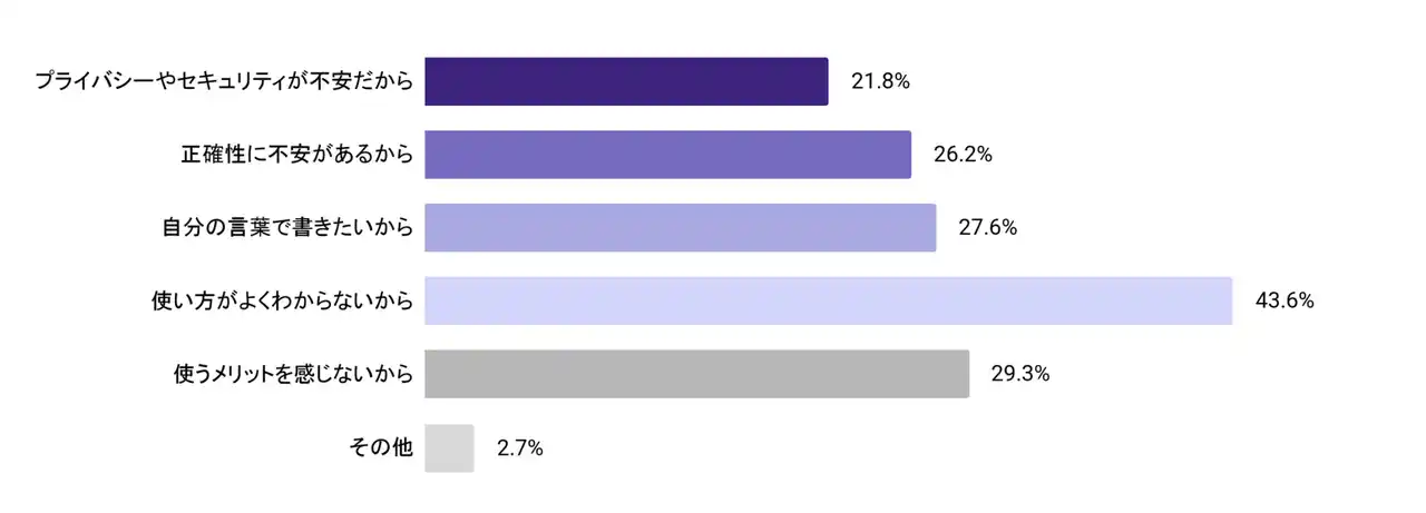 「使い方がよくわからないから」が最も多く43.6%となり、次いで多かったのが、「使うメリットを感じないから」でした。生成AI機能に対する理解不足や価値を実感できないことが、利用のハードルになっていることが分かります。 さらに、自分の言葉で書きたいと考えている方や、正確性やセキュリティへの不安がある方が2~3割程度いました。 |