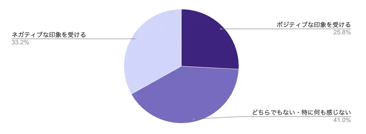 AI生成だと気づいたときの印象は、「特に何も感じない」が最も多く41.0%となりました。 また、「ネガティブな印象」が33.2%、「ポジティブな印象」が25.8% となり、全体として受け止め方はまだ分かれている段階と言えそうです。 |