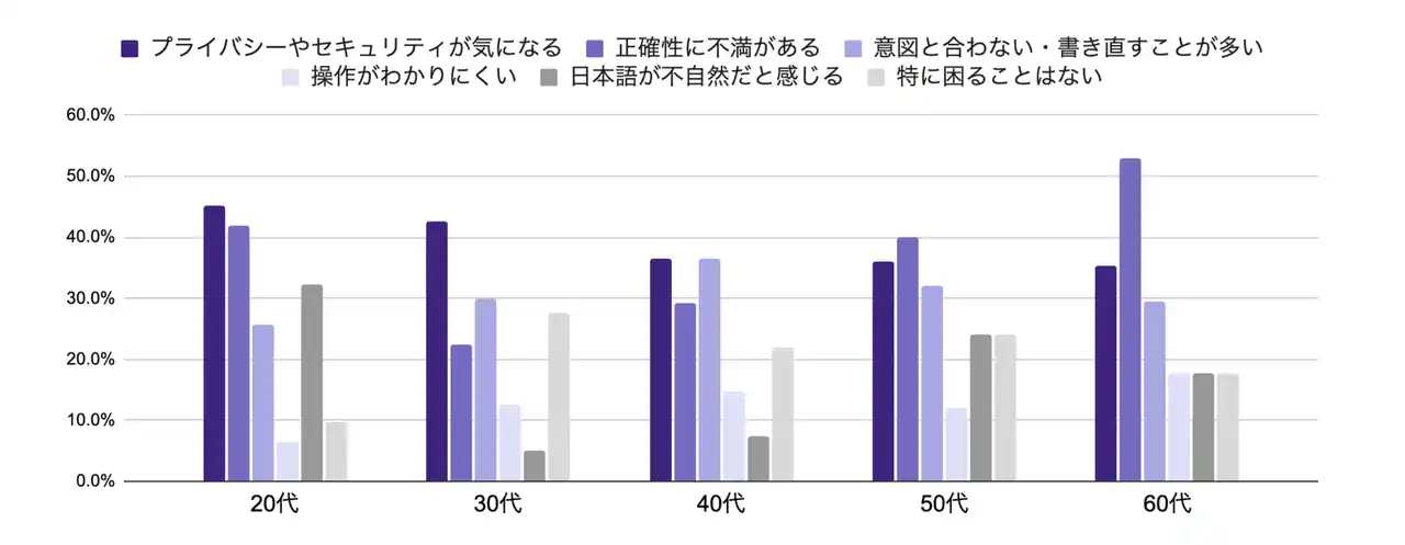 | さらに、年代別に見てみると、20代は「日本語が不自然だと感じる」と回答した割合が他の世代より高い傾向にあり、60代以上は「正確性への不満」が高い結果となりました。 | |||