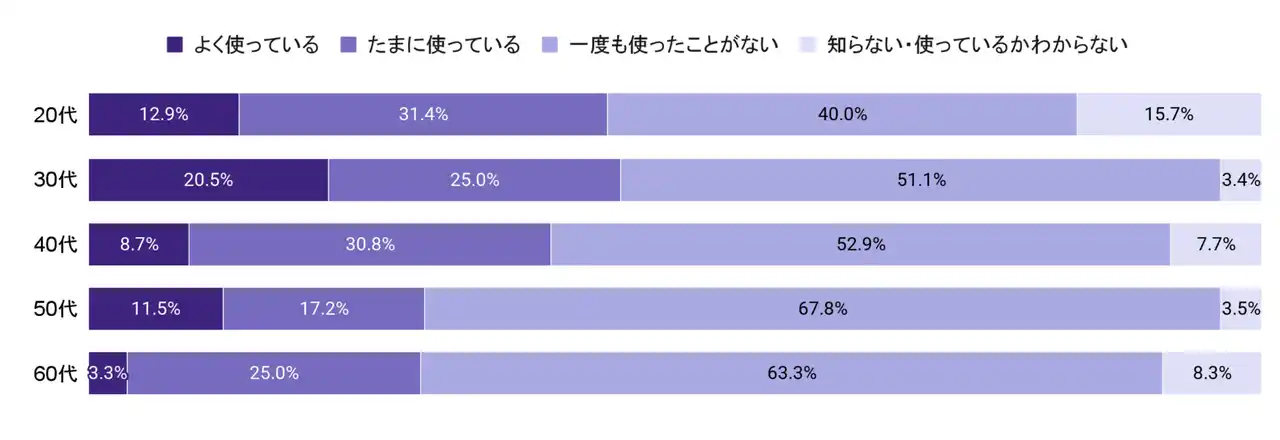 | 「一度も使ったことがない」と回答した方の割合は、概ね年代が上がるほど増加する傾向にありましたが、60代ではやや低下しました。 | |||