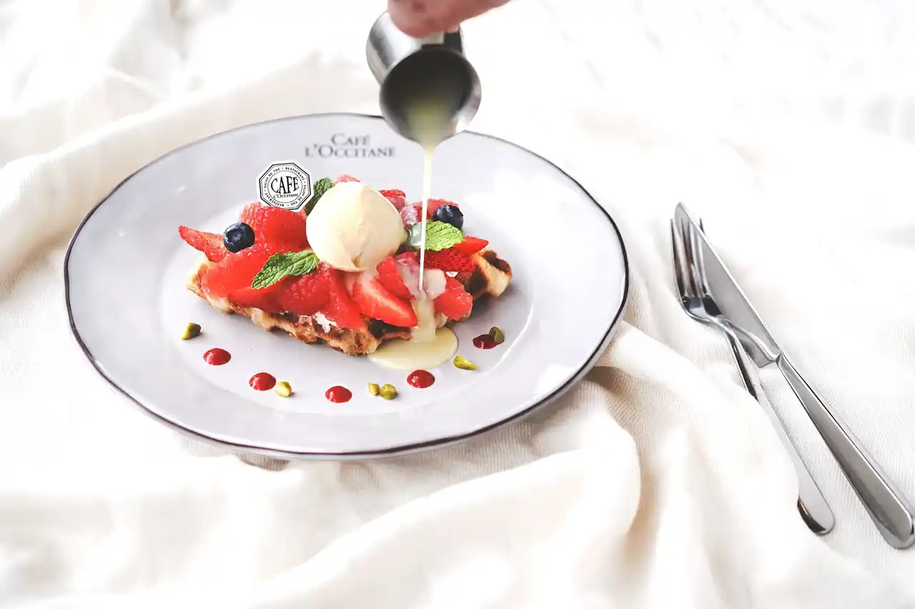 発酵バターの豊かな香りのクロワッサンワッフルに、軽やかなホイップクリームとまろやかなバニラアイス、3種のベリーとピンクグレープフルーツなどを贅沢にあしらい、甘酸っぱいラズベリーソースが全体を華やかに引き立てます。仕上げに、温かいホワイトチョコレートソースをとろりとかければ、香ばしいワッフルと冷たいアイスが織りなす至福のハーモニーが広がります。 |
