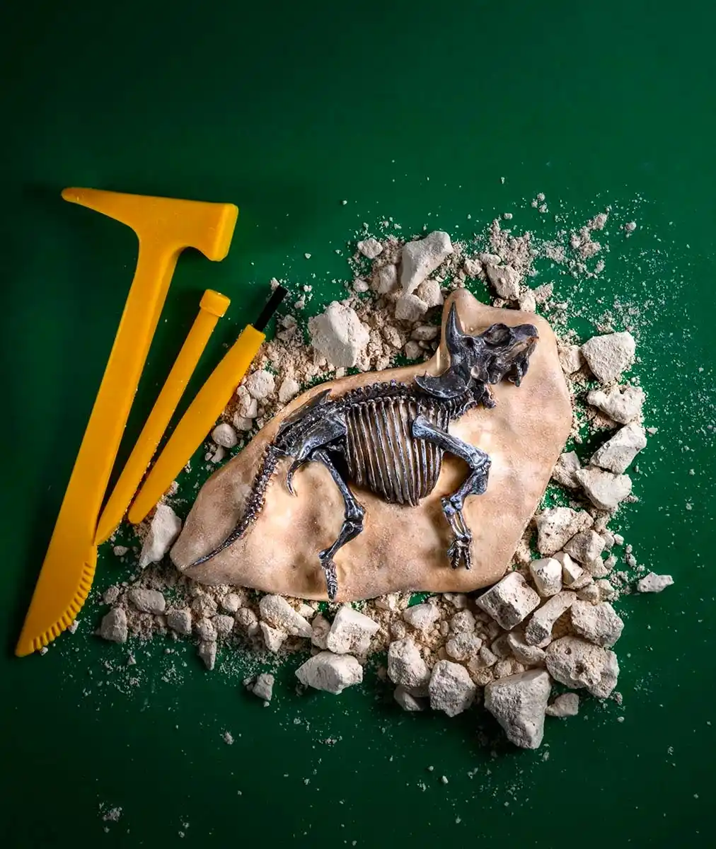 国立科学博物館に展示されているトリケラトプスの化石「レイモンド」の発掘体験ができるキット。アンモナイトの本物化石つき。 |