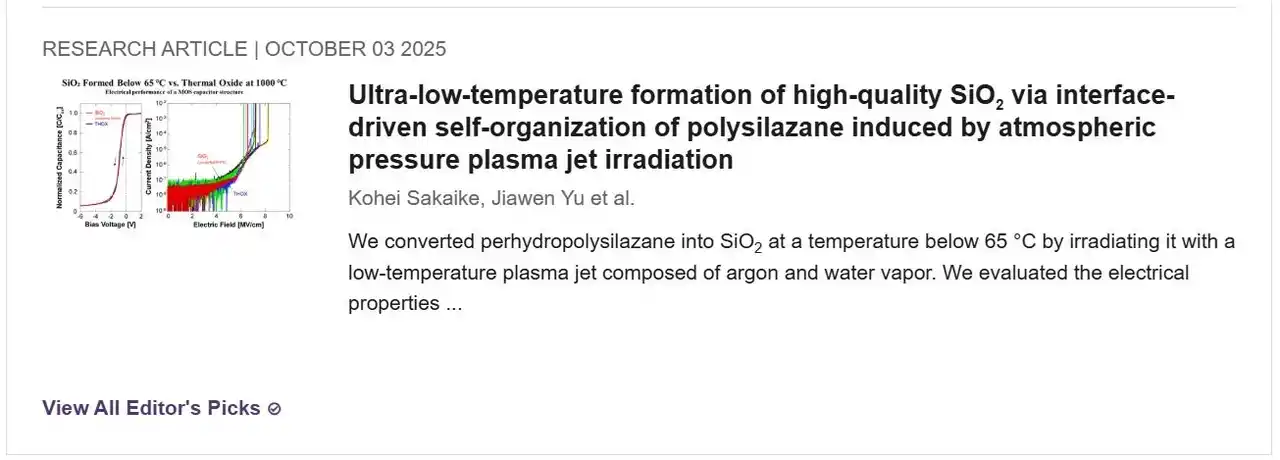 | 本論文は、2024年に AIP Advances に掲載され、「AIP Publishing Showcase」に選出された上記の内容を含む論文 “Silica conversion of polysilazanes by low-temperature plasma jet generated from Ar and water-vapor mixed gas” で得られた成果を基に、その根本原理に焦点を当てたものです。すなわち、なぜ1000℃で形成した熱酸化膜品質(J -E 特性、C -V 特性、界面準位密度、固定電荷密度)に匹敵する SiO2薄膜を、65℃未満の超低温で実現できるのかという問いに対し、界面駆動型自己組織化(interface-driven self-organization:IDSO)モデルを提唱、その根本原理を明らかにしました。 |
