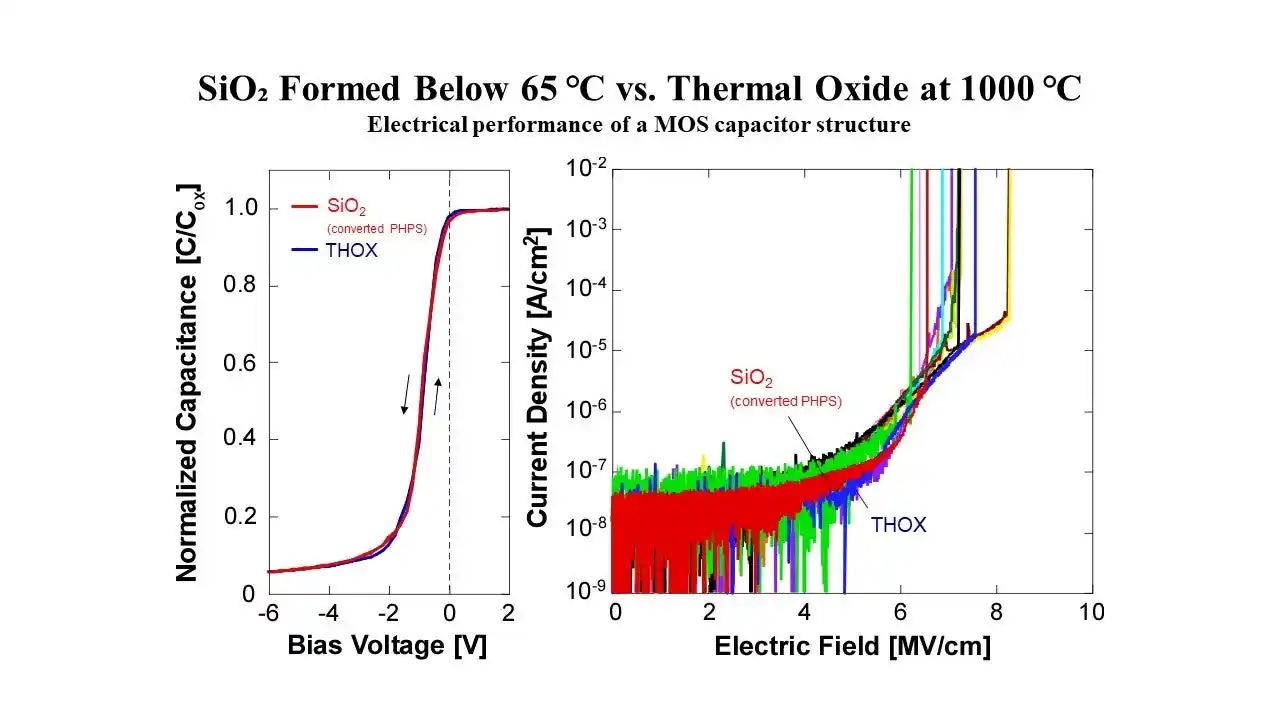 | 研究チームは、これまでに大気圧プラズマを応用した独自のアプローチによりパーヒドロポリシラザン(perhydropolysilazane : PHPS)を、わずか65℃未満という超低温で約1000℃で形成した熱酸化二酸化珪素(SiO2)薄膜と同等の電気特性(J -E 特性、C -V 特性、界面準位密度、固定電荷密度)を示す高品質SiO2薄膜へシリカ転化させることに成功しています。 |