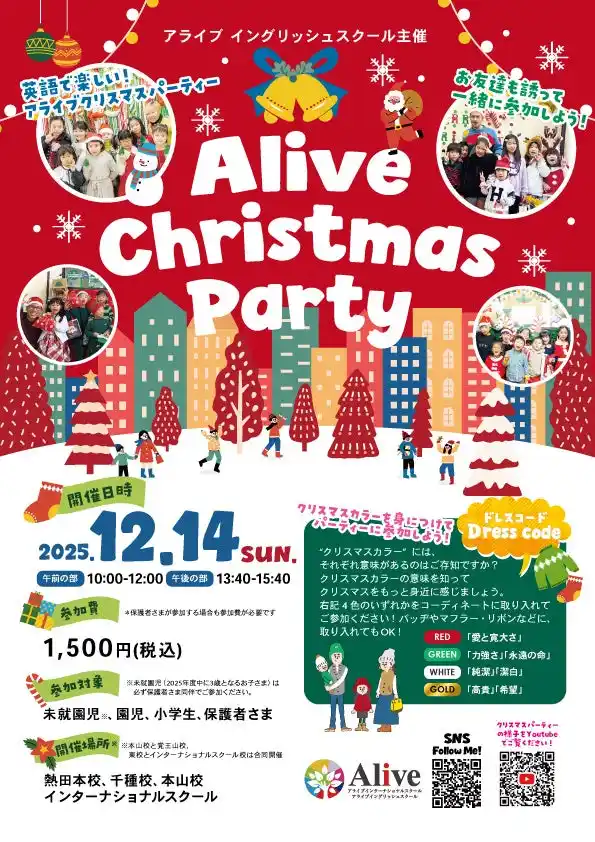 | 株式会社アライブ(本社:愛知県名古屋市、代表取締役:三井博美)は、2025年12月14日(日)に、未就園児、園児、小学生および保護者の方を対象とした英語のイベント『アライブ主催クリスマスパーティー2025』を開催いたします。アライブの在籍生に限定されず、どなたでも参加が可能です。 | |||||||||