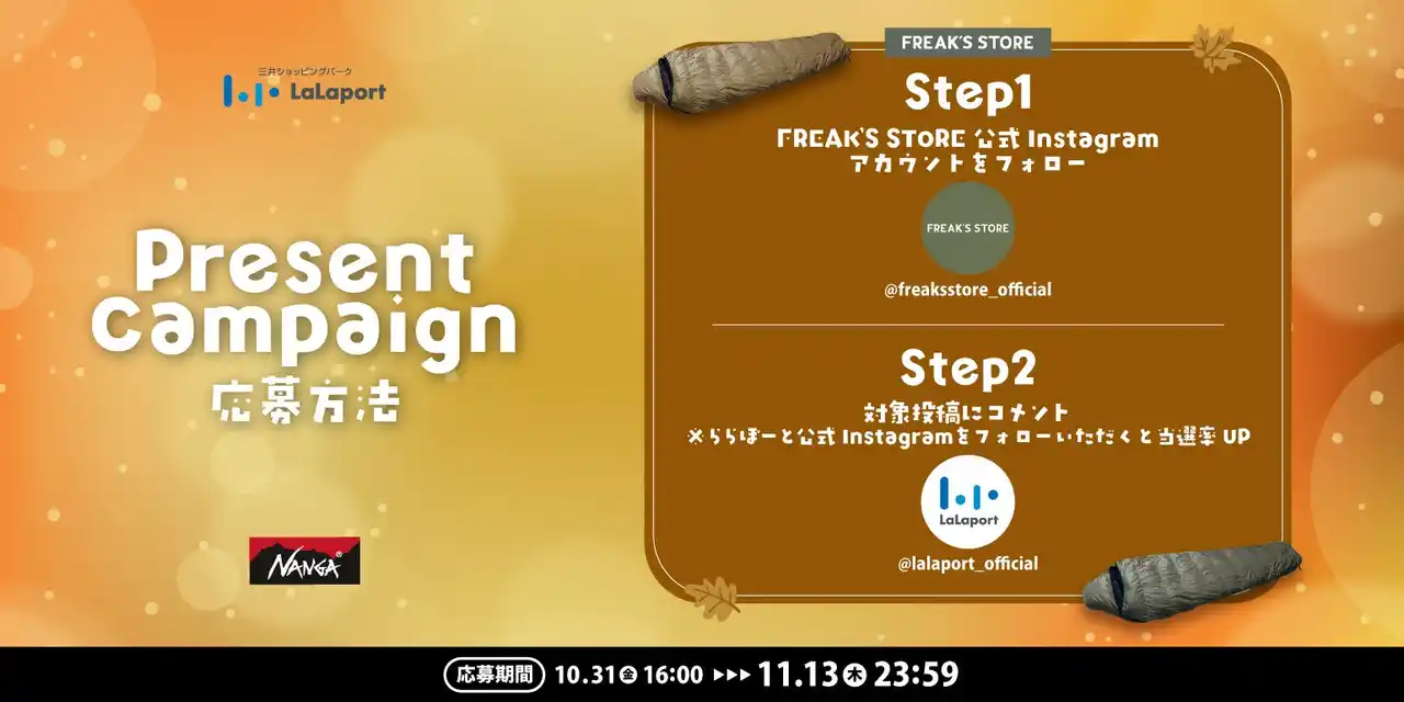 | 毎年大好評のNANGA×FREAK’S STOREコラボレーションを記念し、2025 年 10 月 31 日(金)~ 11 月 13日(木)期間中、『ららぽーとで見つかる!FREAK‘S STOREのNANGAであったか冬支度。NANGA寝袋が抽選で5名様に当たるキャンペーン』を開催。 |