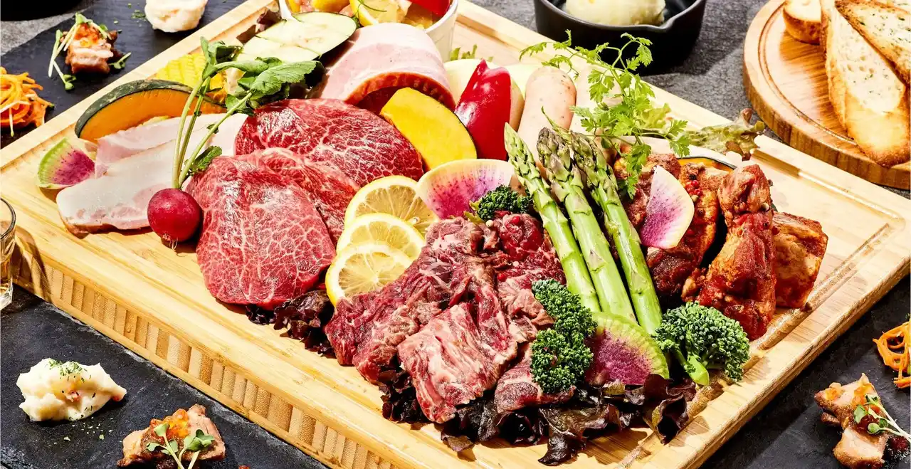 | BBQプレート:季節の野菜4種/粗挽きフランクフルト/ワイルドベーコン/レモンハーブチキン/国産和牛のステーキ&フィレミミ |