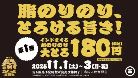 | 『みさき感謝祭』は、11月1日(土)~3日(月・祝)までの3日間に第一弾、11月4日(火)~10日(月)に第二弾を店内飲食限定で開催いたします。第一弾はみさきこだわりのインドまぐろをお楽しみいただけます。脂のり抜群でとろける旨さを味わうことができる「インドまぐろ超のりのり大とろ」が180円(税込)で登場いたします。脂のり抜群の大とろは、「回転寿司みさき」自慢の赤シャリとも相性抜群です。また、第二弾では、寿司をすべて10%OFFでお楽しみいただけます。豊洲直送の鮮度抜群の鮮魚※1も、ボリューム満点で人気を博しているみさきの鬼ネタシリーズも、寿司を全て10%OFFで味わうことができます。 |