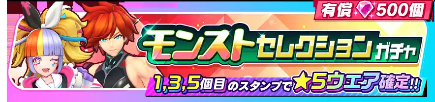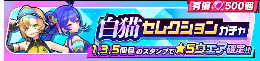 | それぞれ★5ウェアが『モンスターストライク』(以下、『モンスト』)の2キャラクターのみ、『白猫プロジェクト NEW WORLD'S』(以下、『白猫』)の2キャラクターのみが登場するガチャの第2弾が開催予定です。本ガチャは有償ジュエル500個限定で5回までまわすことができ、1回目、3回目、5回目のスタンプでは★5ウェアが確定となります。『モンスト』からはジャック・ザ・リッパー(CV:高橋李依)、エクスカリバー(CV:小西克幸)の2人が、『白猫』からはシャルロット(CV:内田真礼)、ノア(CV:水瀬いのり)の2人が登場します。それぞれのキャラクターは限定ウェアも登場します。 |
