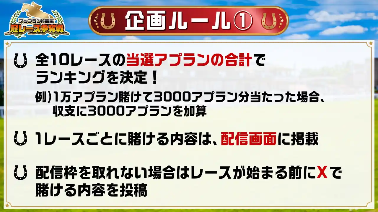 | ・配信枠を取れない場合はレースが始まる前にXで賭ける内容を投稿。 | |||