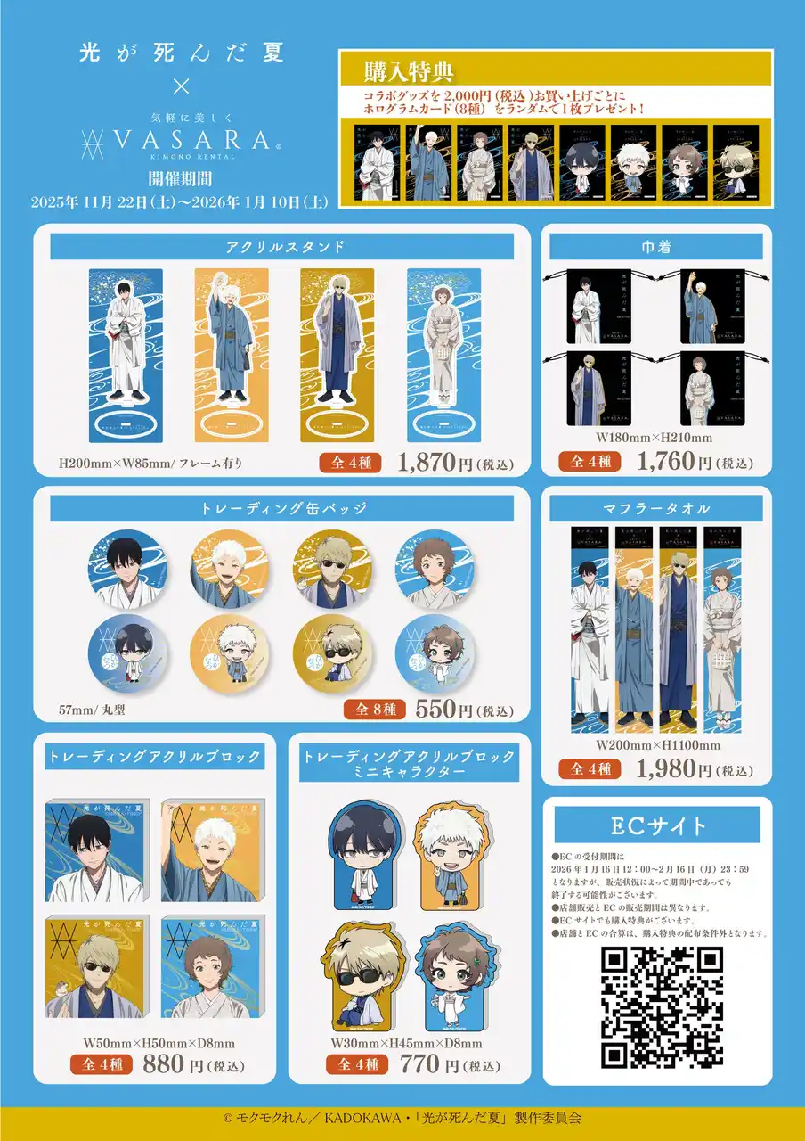 『着物レンタルVASARA』を全国に展開する株式会社バサラホールディングス(本社:東京都千代田区、代表取締役社長:鈴木雄一郎、以下VASARA)は、2025年11月22日(土)~2026年1月10日(土)の期間、TVアニメ『光が死んだ夏』とのコラボキャンペーンを開催いたします。 |
