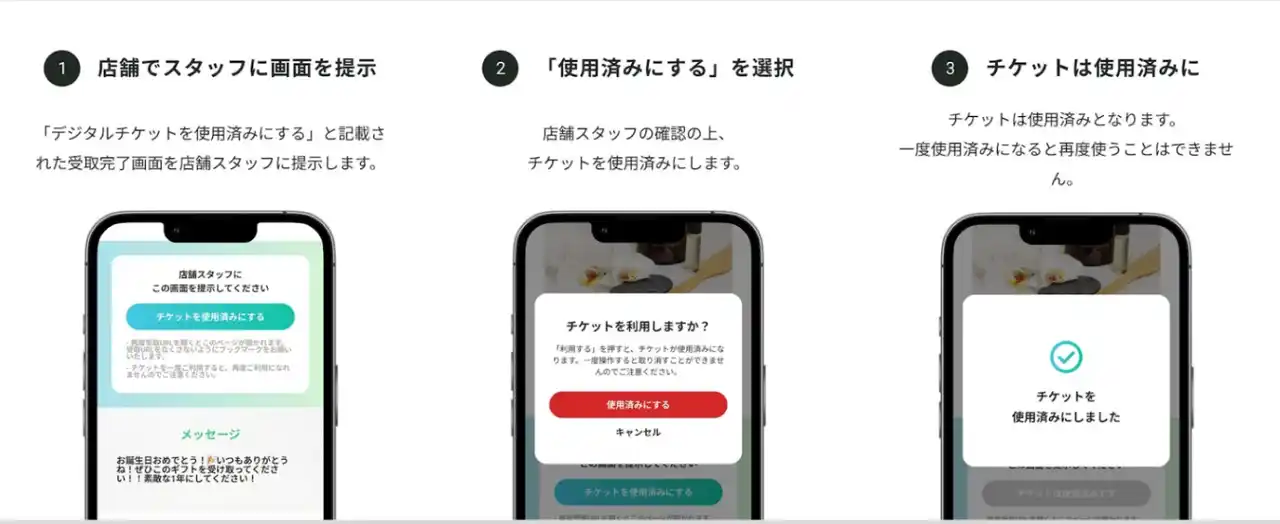 2)店舗スタッフが画面を確認し、チケットを使用済みにします。 |