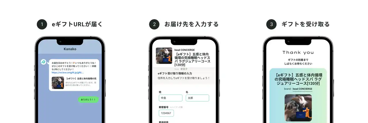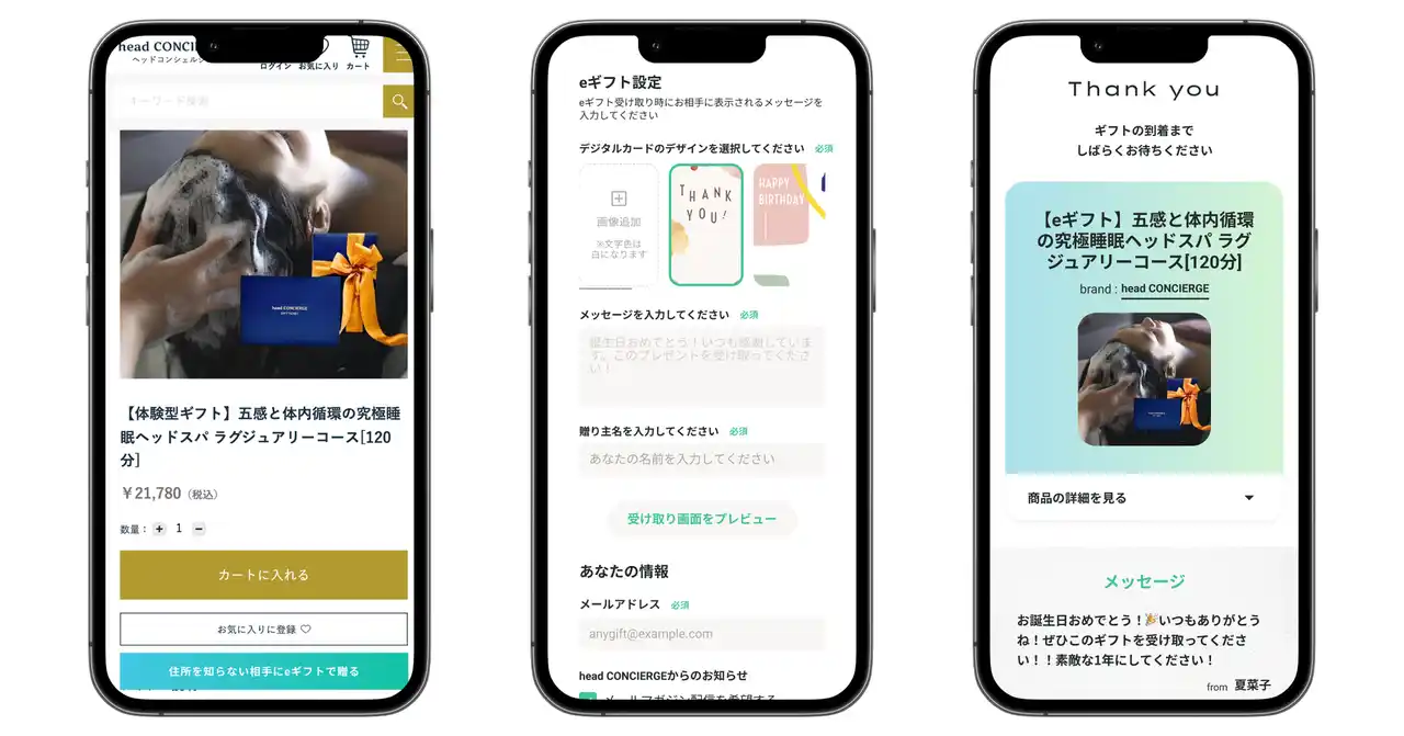 いつもお世話になっている方へのちょっとした贈り物や、ヘッドスパや癒しが好きな方への誕生日・記念日・サプライズをしたいときなど、相手の住所を知らなくても気軽に「ヘッドコンシェルジュ」の店舗でご利用いただけるデジタルチケットをeギフトとして贈ることが可能です。URLはご注文後すぐに発行されるので、すぐに贈ることができます。 |