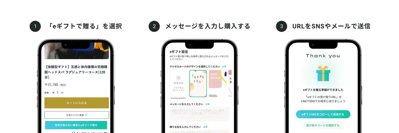 3)購入が完了すると、eギフトの受け取りURLが発行されます。LINEなど各SNSやメールでURLを伝えることでeギフトを贈ることができます。 |