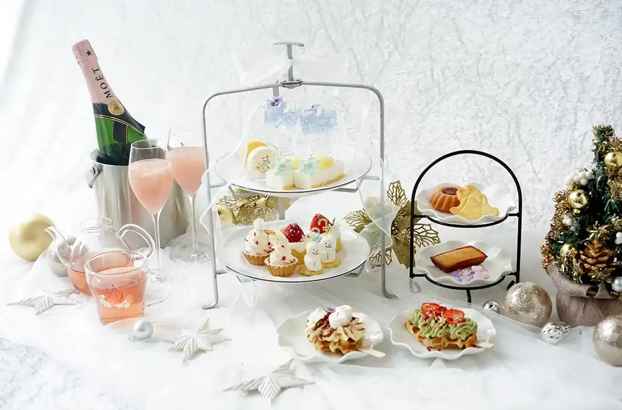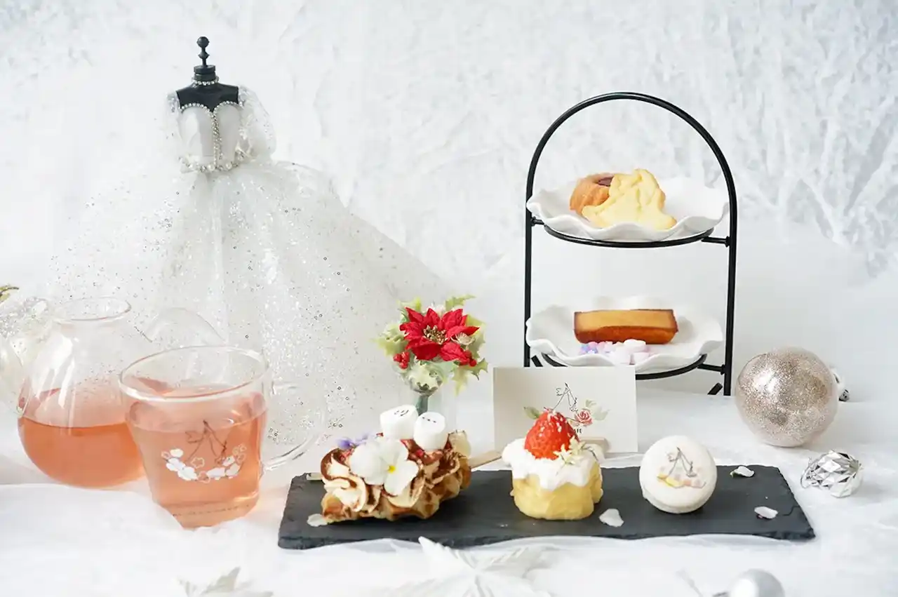 華やかなドレスを中心とした装飾を間近に感じられる店内で、優雅なひとときをお過ごしいただける『お花のアフタヌーンティーセット』をご用意。11月~12月は期間限定、ホワイトクリスマスの世界感を存分に感じられるキュートなスイーツたちが並ぶ、シーズン限定のスペシャルなアフタヌーンティーです。コースには「DRESSY CAFE」オリジナルのオーロラウェルカムシャンパンや、「オリジナルドレスアップティー」の飲み放題もセットになっている豪華コースです。 お花のアフタヌーンティーにウェディングドレスを着てセルフフォトを楽しめるセットコースも大人気。 |