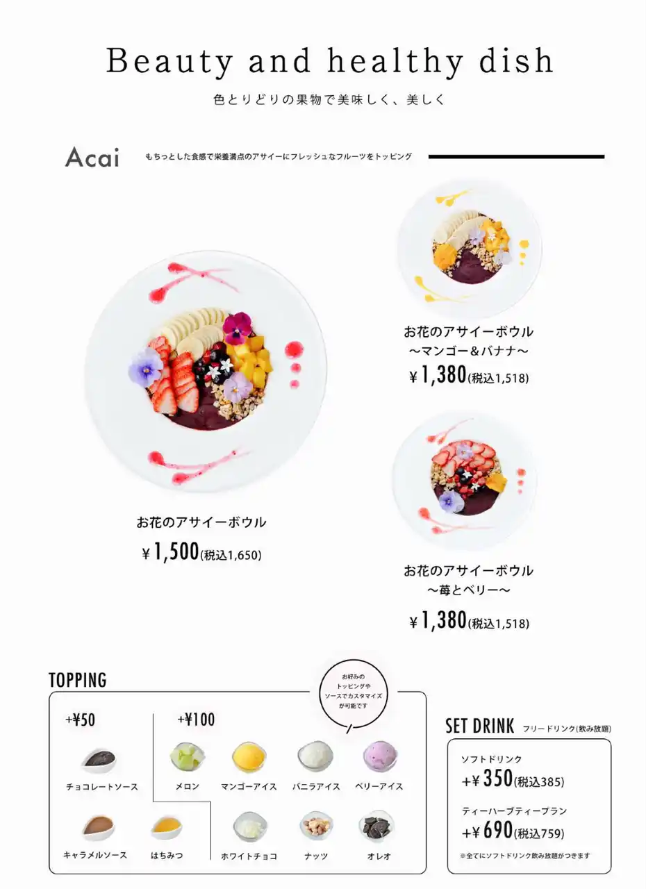 DRESSY CAFEで大人気のお花のアサイーボウル。栄養豊富なアサイーをベースに、ビタミン・ミネラルなどの栄養を豊富に含んだ様々なフルーツをふんだんに使用し、色とりどりの果物で美味しく、美しく、美と健康を考えた1品です。また、DRESSY CAFEらしくエディブルフラワーがトッピングされ、 見た目も華やかでお楽しみいただけます。 また、クロワッサン生地をワッフルのようにプレスし、さくさくな生地からはみ出すほどのたまごやチーズ、キーマカレーなどを挟んだ満腹フード、クロッフルサンドも登場。バラエティ豊かに4種類からお選びいただけます。 |