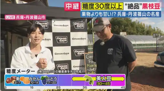 兵庫県丹波篠山市のGREENDAYS FARM(代表:上本浩之)が手がけるブランド黒枝豆「美人豆」が、先日(2025年10月30日放送)の関西テレビ『旬感LIVE とれたてっ!』の生中継にて紹介されました。平均糖度30度以上、最大45度にも達するその驚異的な甘さが「果物よりも甘い」と注目を集めています。 |