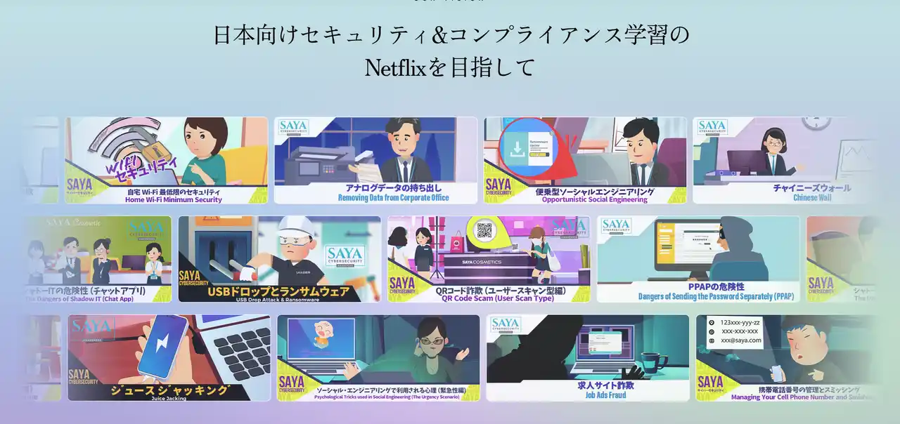 SAYA Universityは、人の意識と行動こそが最大の防御であるという理念のもと、アニメーション形式のマイクロラーニングで実際の事例に基づいたサイバーセキュリティ教育を提供し、従業員を「弱点」から「強力な防衛線」へと変えるプログラムを展開してきました。国内最大級の日本語セキュリティ学習ライブラリを擁し、最新の脅威や具体的な攻撃ケースに即したコンテンツを豊富に取り揃えています。 |