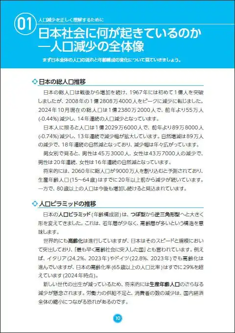 人口減少は単なる政策や統計の話ではありません。採用、人材定着、事業継続、地域連携など、日々の業務や経営判断のすべてに影響を与えます。そして働く一人ひとりの仕事や暮らし、キャリア、地域とのつながり......つまり、私たち自身に深く関わっている問題です。 |