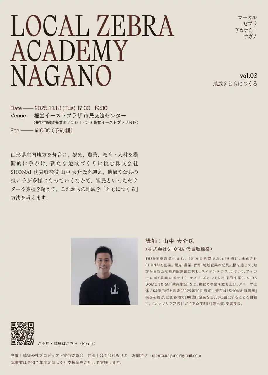 LOCAL ZEBRA ACADEMY NAGANO vol.3 地域をともにつくる 開催日時:2025年11月18日(火)17:30~19:30 会場:長野市権堂イーストプラザ 市民交流センター(〒380-0833 長野市大字鶴賀権堂町2201番地20(権堂イーストプラザND1階)) 講師:山中 大介氏(株式会社SHONAI 代表取締役) 定員:50名 参加費:1,000円(当日会場で現金でお支払いください) 主催:鎮守の杜プロジェクト実行委員会/合同会社もりと ※イベント終了後に懇親会を開催します。参加をご希望の方は、イベントご予約の際に申し込みフォームにてご予約ください。 予約:https://localzebra-nagano-03.peatix.com |