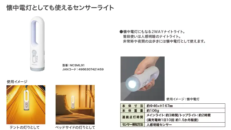 | インテリア家電製品および、PCサプライ品の製造販売を手掛ける株式会社ヤザワコーポレーションは、懐中電灯としても使えるセンサーライトを11 月中旬頃発売いたします。 |