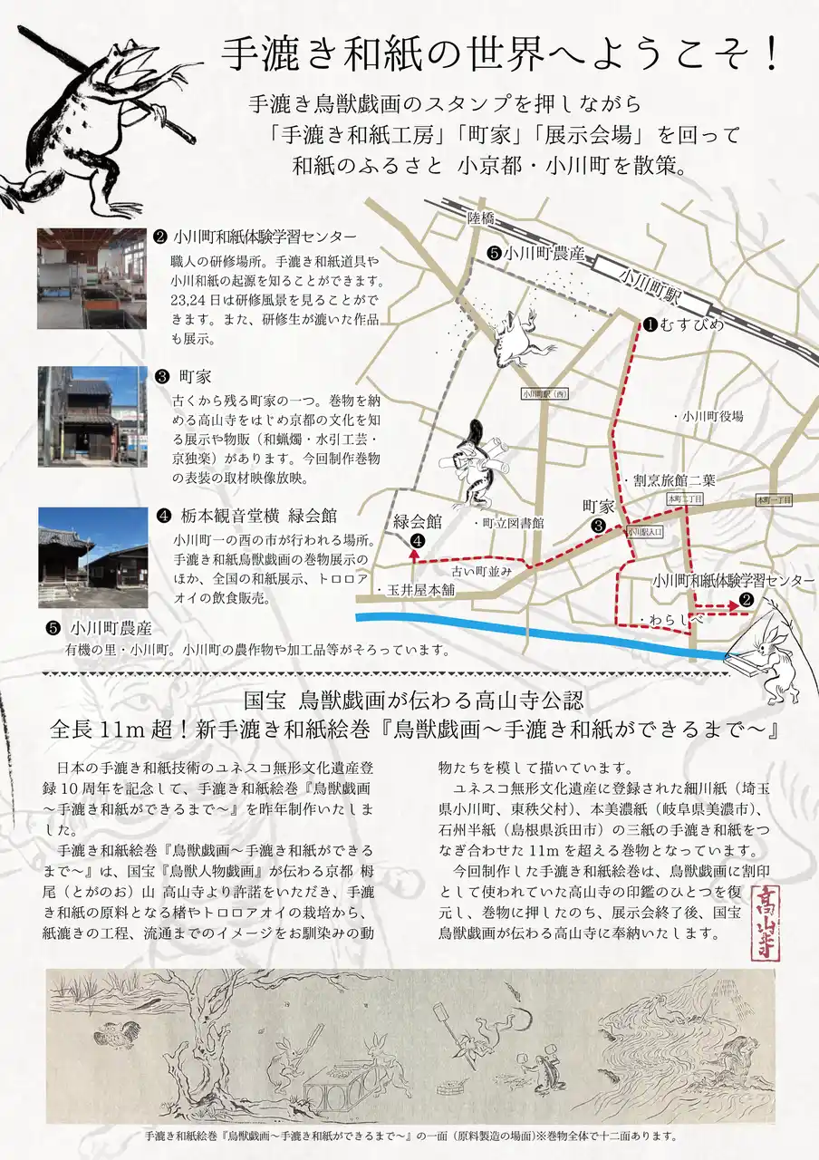 【日時】 11月22日(土)~11月24日(月・祝) 午前10時~16時(初日12時から、最終日15時まで) 【場所】 埼玉県比企郡小川町(東武東上線・JR八高線) ※公共交通機関をご利用ください。 【会場】 ・小川町観光案内所むすびめ (受付・小川町駅前) ・小川町和紙体験学習センター ・町家 ・栃本観音堂横 緑会館 【内容】 ・『鳥獣戯画~手漉き和紙ができるまで~』巻物展示 ・手漉き鳥獣戯画はがき制作スタンプラリー ・手漉き和紙に関するパネル、和紙、原料展示 ・小川町和紙体験学習センター見学(研修生の作品展示・研修生実習見学) ・手漉き和紙鳥獣戯画グッズ、オリジナル和紙雑貨、手漉き和紙販売 ・京都市の伝統工芸展示販売(和蝋燭・水引工芸・京独楽・京表具映像公開) ・トロロアオイ加工品飲食販売 ・小川町農産で小川の農作物販売 ・本企画者によるガイドツアー(申込み制・有料(街を歩きながら解説)) 【入場料】1000円(手漉き鳥獣戯画スタンプ用手漉き和紙はがき付き) |