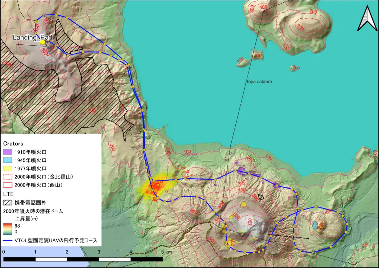 2025年10月22日、株式会社空解(代表取締役:森田直樹)は、北海道大学広域複合災害研究センター・札幌開発建設部河川整備保全課・(株)ネクシス光洋・(株)エアフォートサービス・リーグルジャパン(株)と共同で、火山噴火災害を想定した地形測量調査を北海道・有珠山周辺にて実施しました。 本実証では、空解社製VTOL(垂直離着陸)型固定翼UAV「QUKAI MEGA FUSION 3.5」に、リーグル(RIEGL)社製高性能LiDAR「VUX-120-23」(7kgペイロード/ LiDER用バッテリー含)を搭載し、標高差約400mを含む往復30kmのフルオート飛行を成功させました。 火山噴火を想定した条件下で、レベル3.5飛行によるレーザー測量を実施したのは日本初の事例です。 |