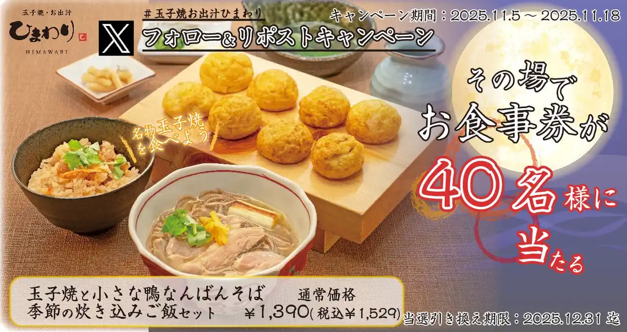 あわせて、玉子焼・お出汁ひまわり公式Xアカウントをフォロー&リポストして応募すると、抽選で40名様に「玉子焼と小さな鴨なんばんそば 季節の炊き込みご飯セット1人前(税込み1,529円)」をお召し上がりいただけるデジタルお食事券プレゼントキャンペーンを2025年11月5日(水)より開催します。この機会にぜひご応募ください。 |