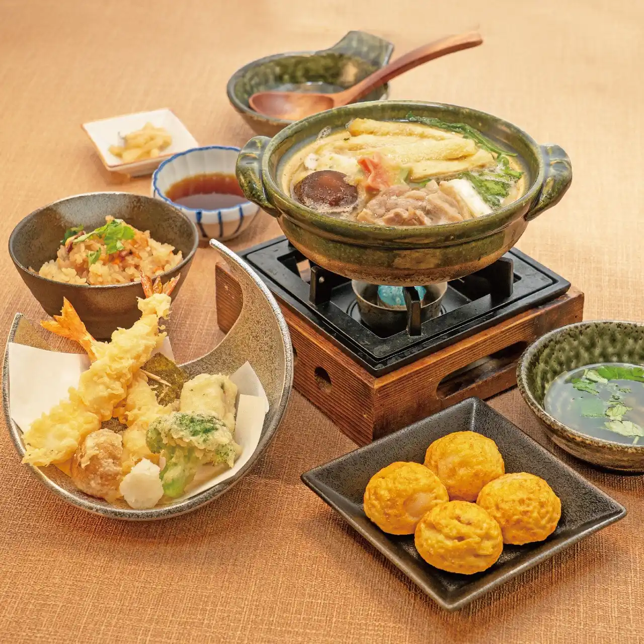 特製お出汁で合鴨、旬の野菜をグツグツ炊き込んだ鴨鍋。合鴨の旨味とお出汁の香りをまとったうどんで心も体もぽっかぽか!名物玉子焼、旬の野菜を使用した揚げたて天ぷらと具材の旨味を味わう炊き込みご飯が付いた御膳です。 |