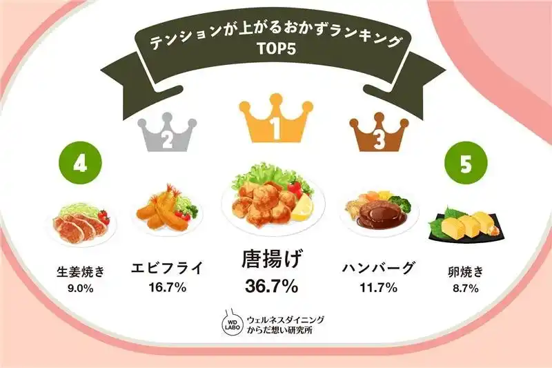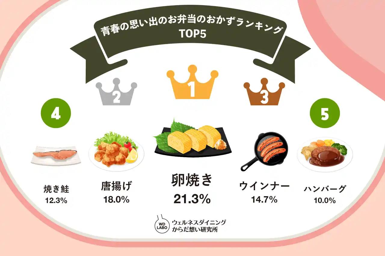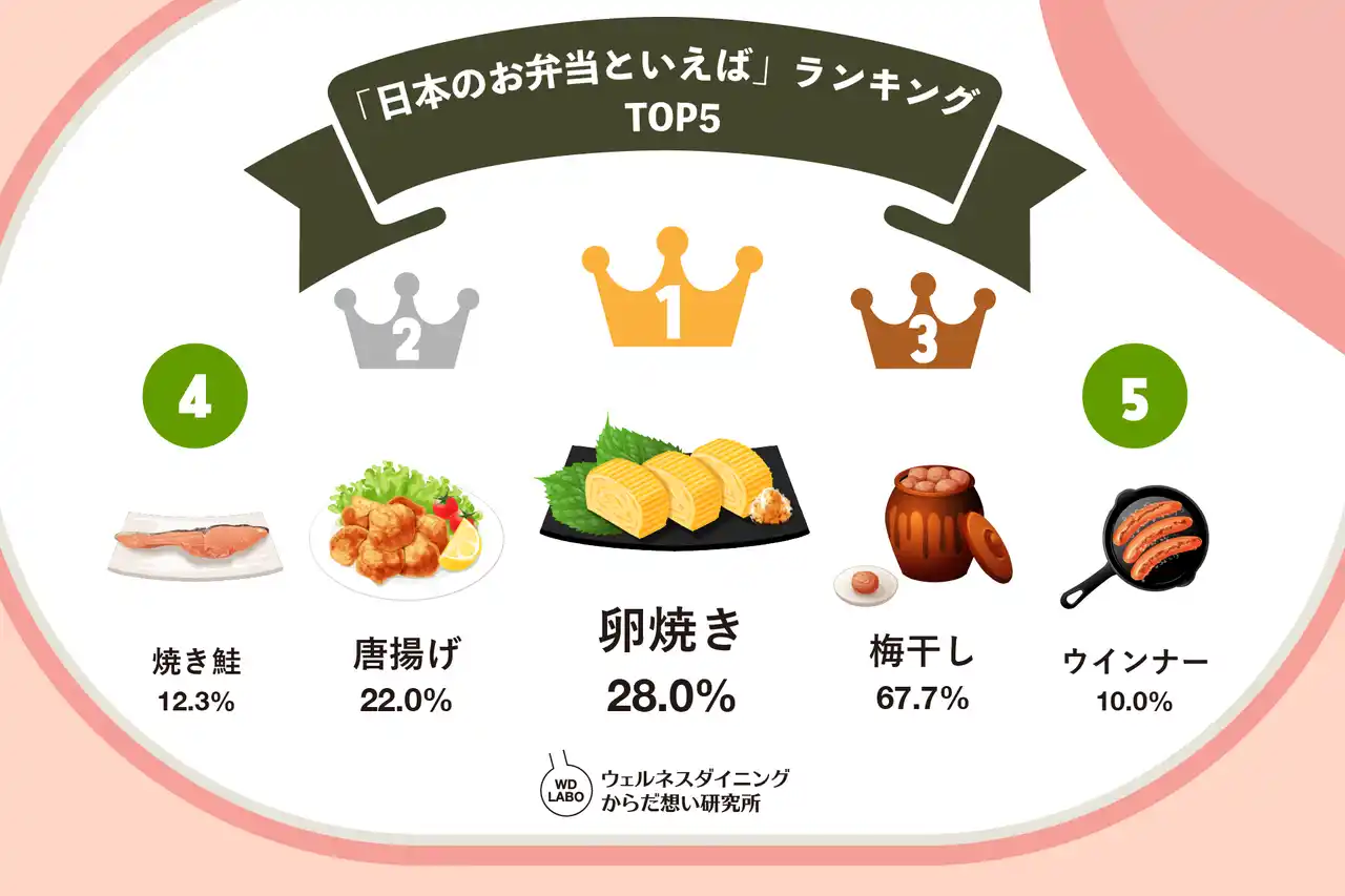 ・ テンションが上がるおかず:1位 唐揚げ、2位 エビフライ ・ 地味だけど最高においしいおかず:1位 ちくわの磯辺揚げ、2位 きんぴらごぼう ・ 日本のお弁当といえば?:1位 卵焼き、2位 梅干し ・ 青春時代の思い出のおかず:1位 卵焼き、2位 唐揚げ |
