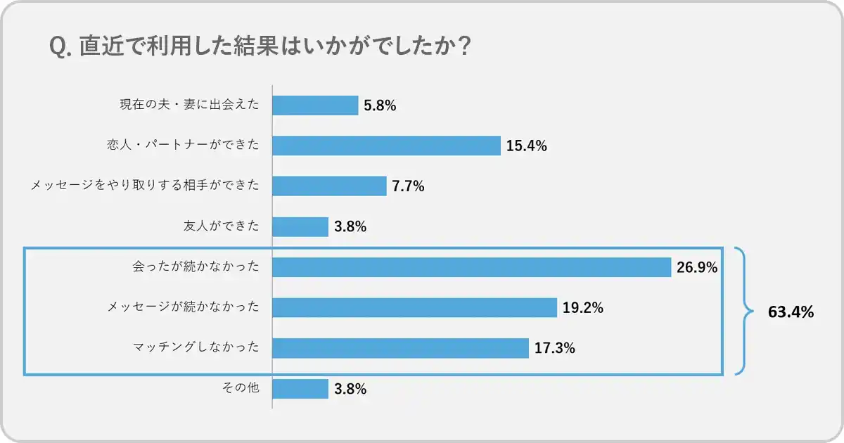 2. 期待した出会いに発展できた人は約4人に1人 40代以上のマッチングアプリ利用者のうち、約63.4%は利用結果に満足していないことが分かりました。 恋人・パートナー・友人など、期待していた形の出会いに発展したのは約25%に留まっています。 「メッセージが続かない」「実際に会う前にやり取りが途切れる」といった、関係構築の難しさが浮き彫りになりました。 |