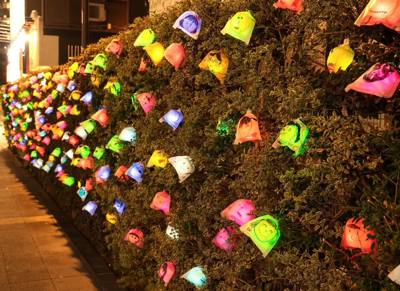 美術家の高橋匡太さんが考えた、みんなで作るイルミネーション作品。果実袋にあなたの大好きな人の「えがお」を描き、LEDの光を入れて樹木に取り付けます。みんなの「えがお」が、たくさんの「ひかりの実」となって灯り、あたたかな夜の風景をつくります。京急蒲田あすと東側入口にて。 |