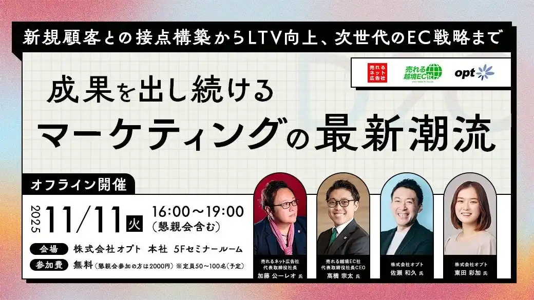 | 売れるネット広告社株式会社(本社:福岡県福岡市、代表取締役社長CEO:加藤公一レオ、東証グロース市場グループ会社(売れるネット広告社グループ株式会社:証券コード9235)、以下 売れるネット広告社)は、2025年11月11日(火)に、『新規顧客との接点構築からLTV向上、次世代のEC戦略まで。成果を出し続けるマーケティングの最新潮流』セミナーを開催いたします。 | |||||||