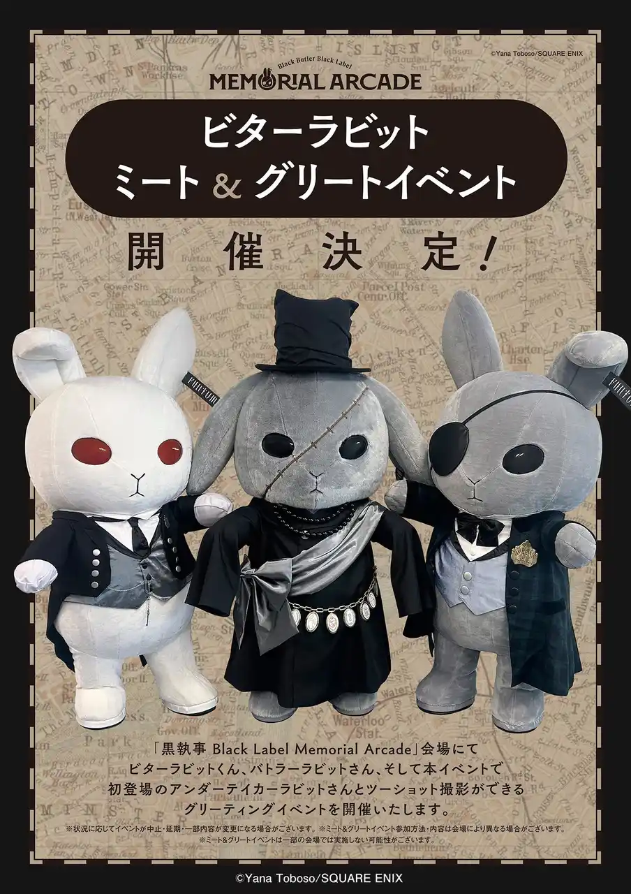 「黒執事 Black Label Memorial Arcade」開催を記念して、ビターラビットくん、バトラーラビットさん、そして本イベントで初登場のアンダーテイカーラビットさんとツーショット撮影ができるグリーティングイベントを開催いたします。 |