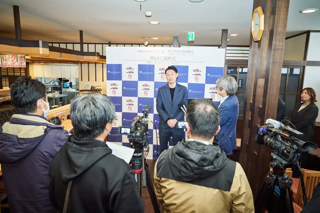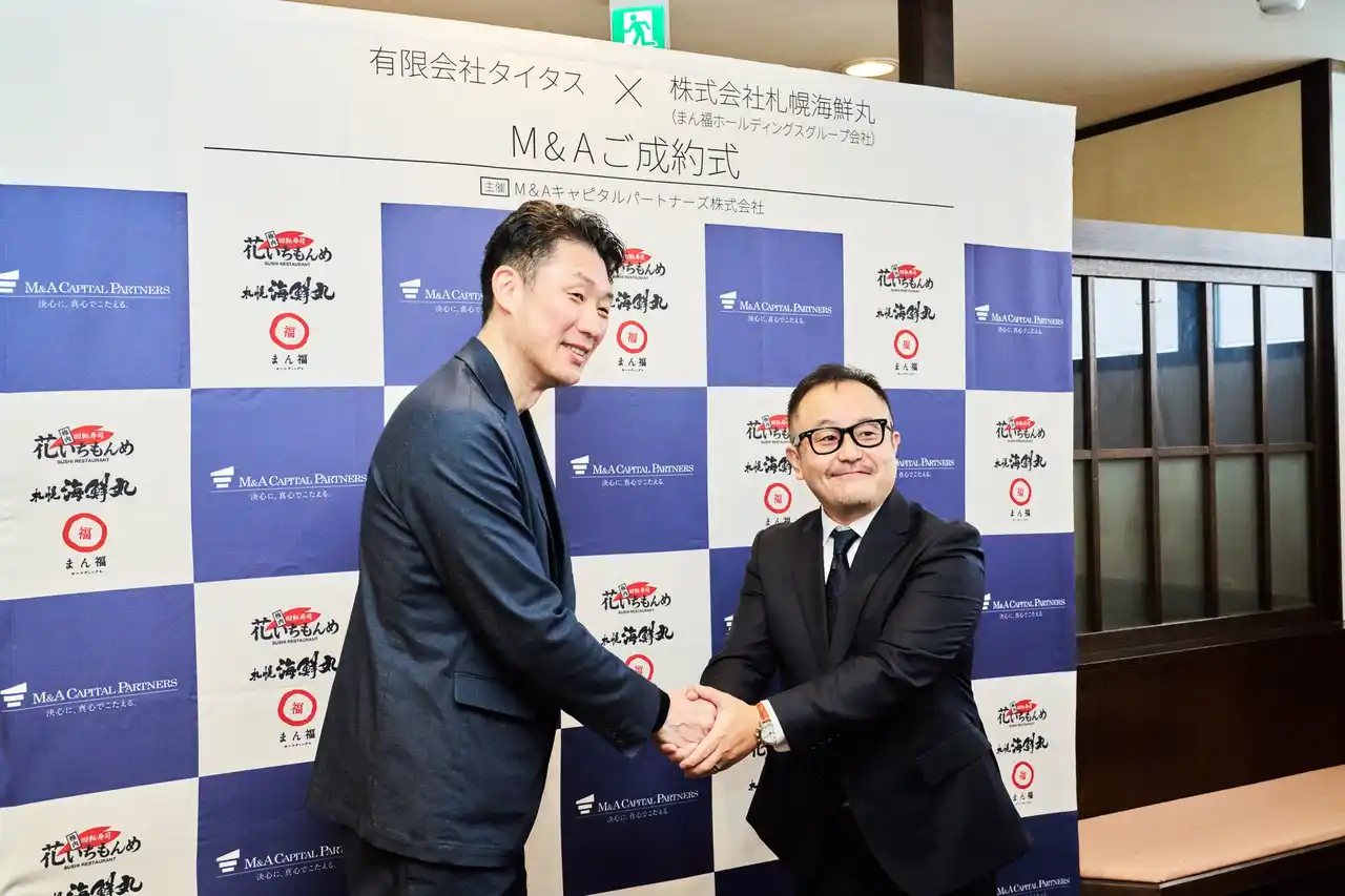 M&Aキャピタルパートナーズ株式会社(東京都中央区・代表取締役社長 中村悟)は、回転すし店「花いちもんめ」を運営する稚内市の有限会社タイタスと、札幌市に本社を構え、持ち帰り寿司店を主に事業展開を行う株式会社札幌海鮮丸(日本の食に特化した事業承継プラットフォームを展開するまん福ホールディングスのグループ会社)のM&Aを仲介いたしました。2025年11月4日に、花いちもんめ稚内本店にて、M&A成約式を開催いたしました。 |