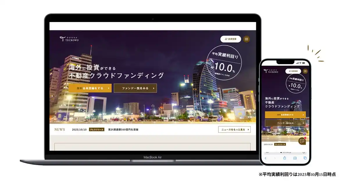 TECROWDは1口10万円から不動産に投資ができるサービス(クラウドファンディング)です。投資するにあたり物件選びから契約まで、すべてオンラインで完結するため、手軽に不動産への投資が始められます。 |