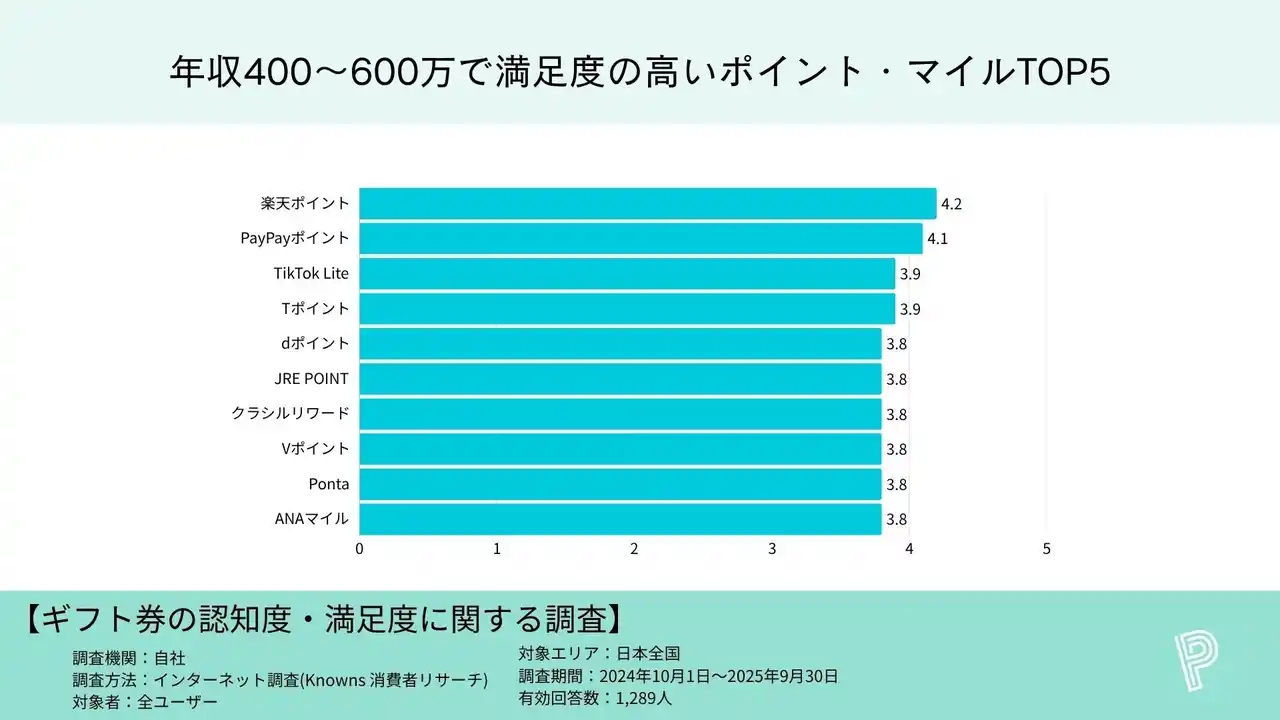 楽天ポイント4.1、PayPayポイント4.1、Tポイント3.9、dポイント3.8、JRE POINT・TikTok Lite・WAON POINTが各3.8(同率) |