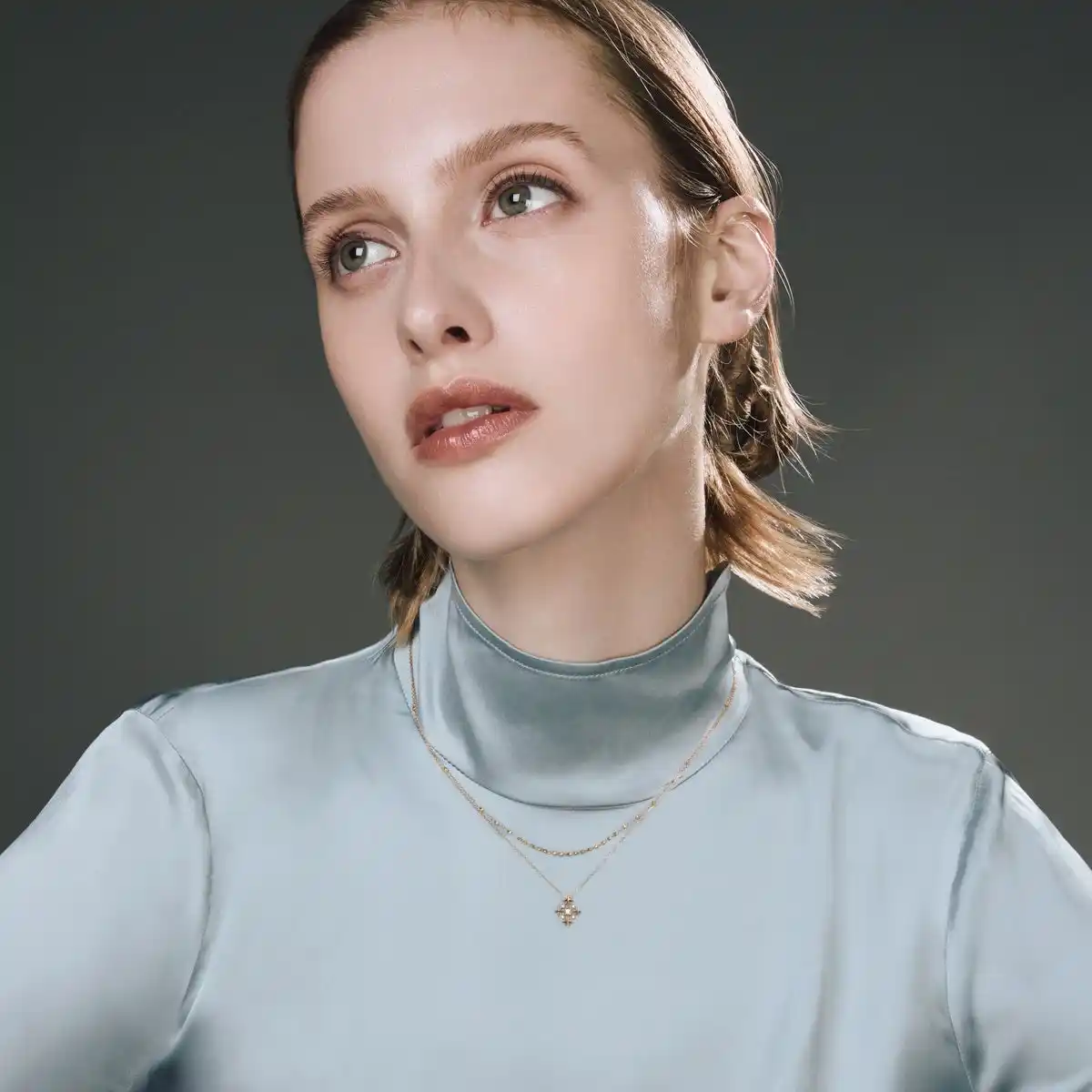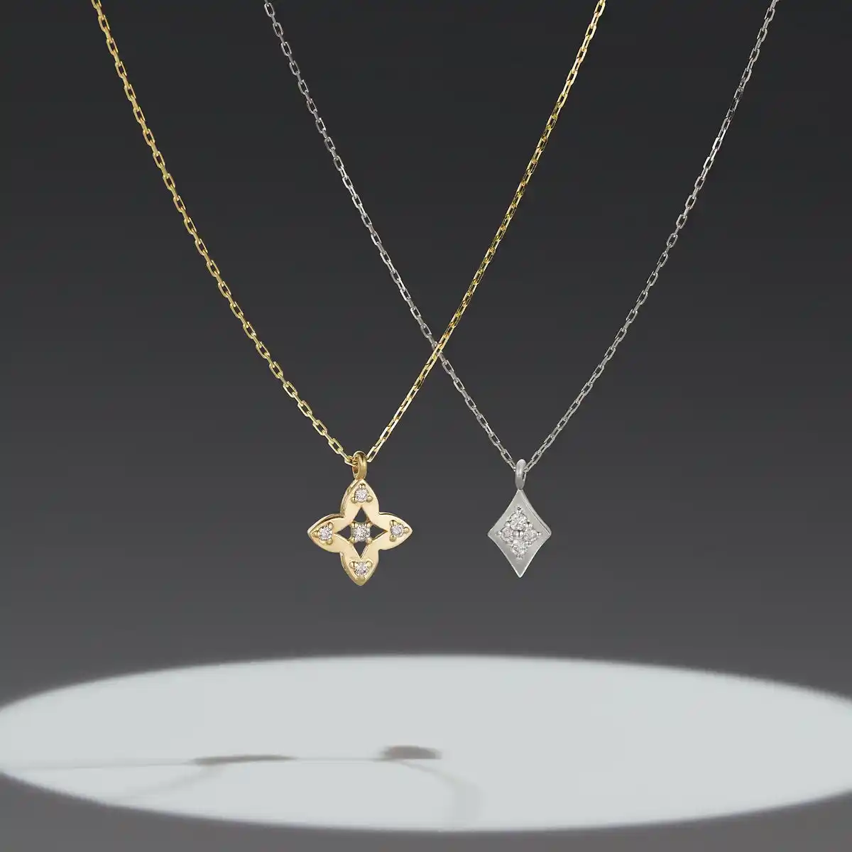 柔らかな4枚花のシルエットと繊細な透かし模様のネックレスは、すっきりとした光のシルエットの空間があることで甘さが抑えられ上品でモダンな印象に。 |