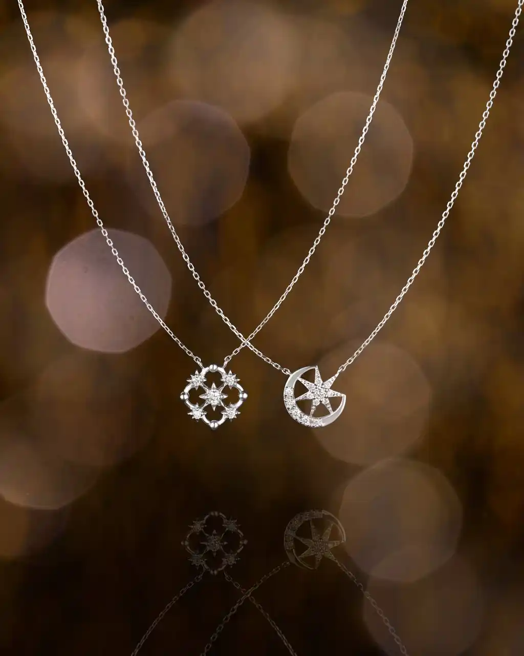 ホリデー限定ネックレスは、レースのような繊細なデザインでエレガントな輝きを放ち純粋で上質なプラチナとダイヤモンドの煌めきが、身につける人の魅力を引き立てます。三日月に星を閉じ込めたロマンティックなデザインが特徴のネックレスは、アシンメトリーなフォルムがスタイリッシュな印象を与え、胸元を華やかな印象にしてくれます。 |