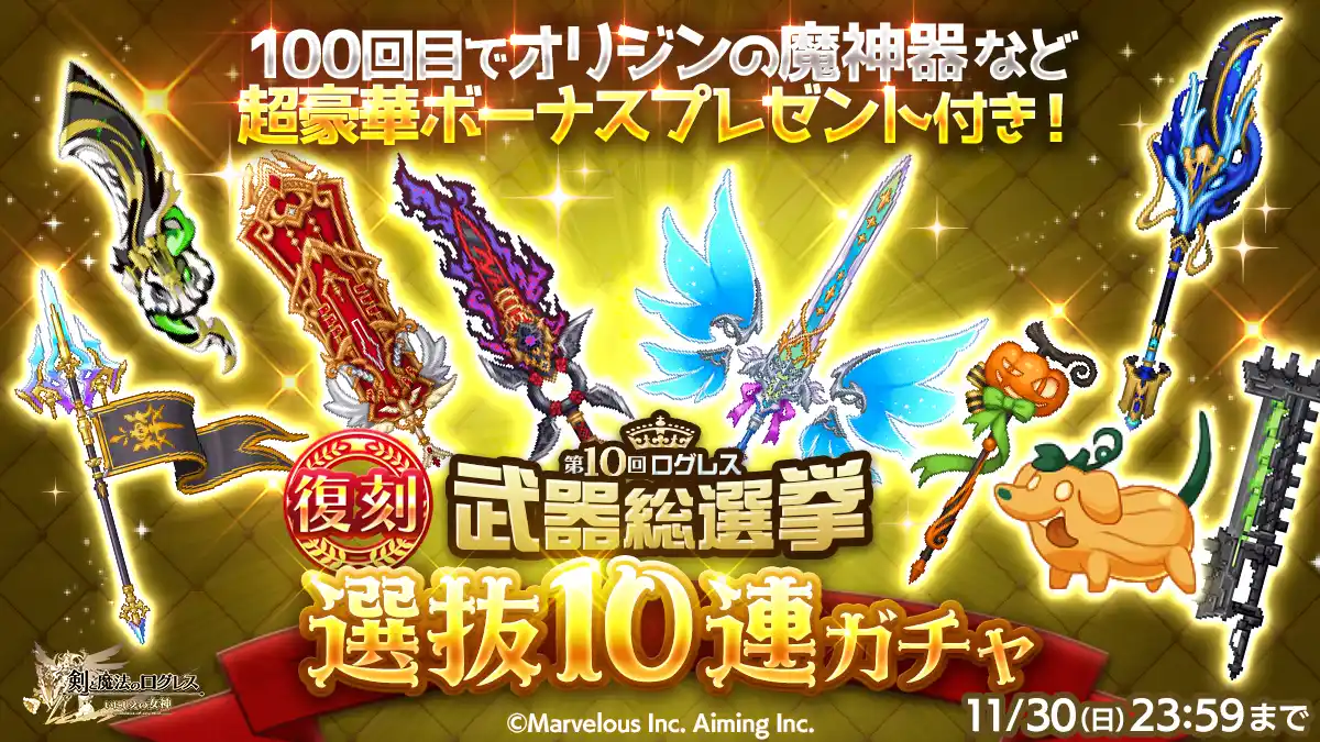 株式会社マーベラス(代表取締役社長:照井 慎一/所在地:東京都品川区)は、スマートフォン向け本格オンラインRPG『剣と魔法のログレス いにしえの女神』において、2025/11/5(水)に「12周年前夜祭-前編-」の開催、2025/11/1(土)に新武器がラインナップした「ジョブ別 斑鳩確率アップガチャ」の販売を含むアップデートを行ったことをお知らせいたします。 |