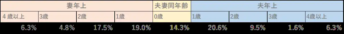 最も多いのは夫1歳年上のパターンですが、次いで妻1歳年上、妻2歳年上と続いています。 |
