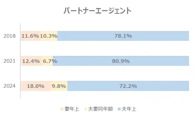 人口動態調査における妻年上婚は2018年の24.0%から2024には25.5%と1.5ポイントの増加となりました。一方、パートナーエージェントでは2018年の11.6%から2024年には18.0%へと6.4ポイントも増加しており、結婚相談所の方が妻年上婚のニーズを顕著に反映する結果となりました。 |