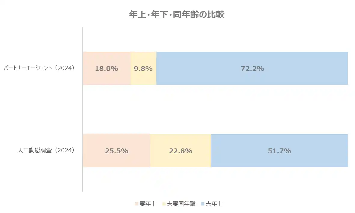人口動態調査では「25.5%が妻年上婚」という結果に対し、結婚相談所では18.0%と、依然として夫年上の割合が高くなっています。 |